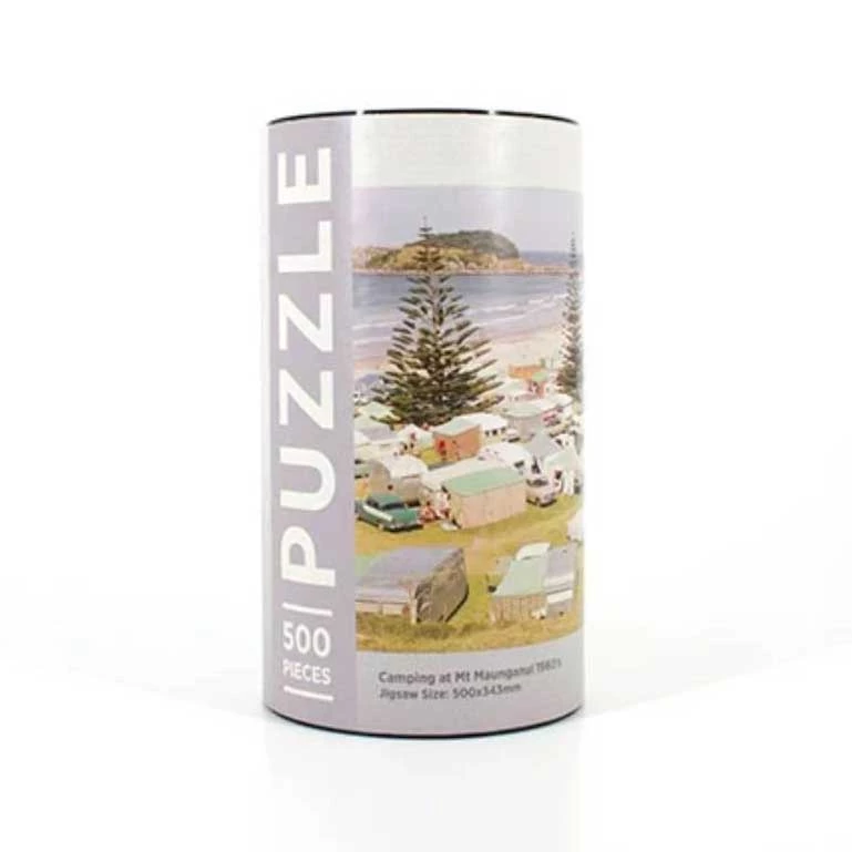 A 500 piece jigsaw puzzle featuring a 1960’s retro Mount Maunganui camping scene.