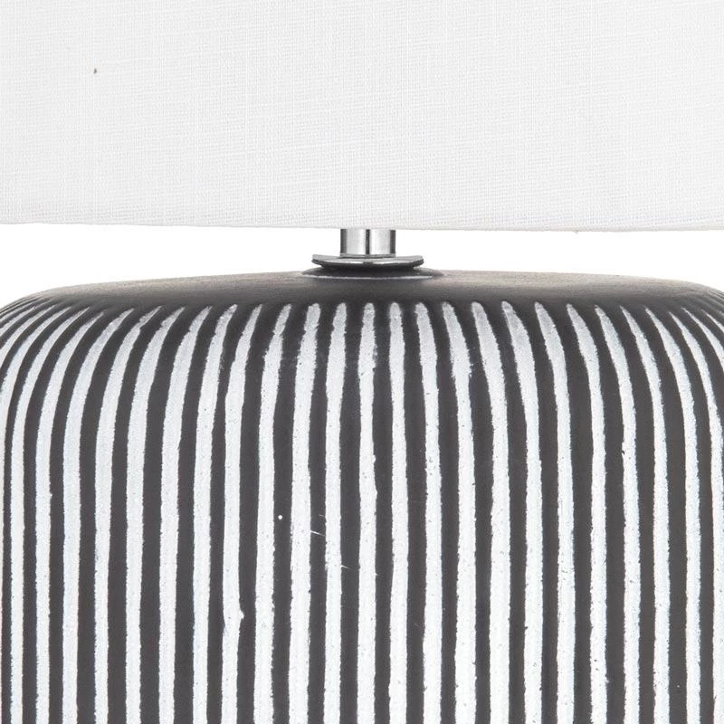 The body features a textured finish in a vertical striped design, complemented by the white lamp shade.