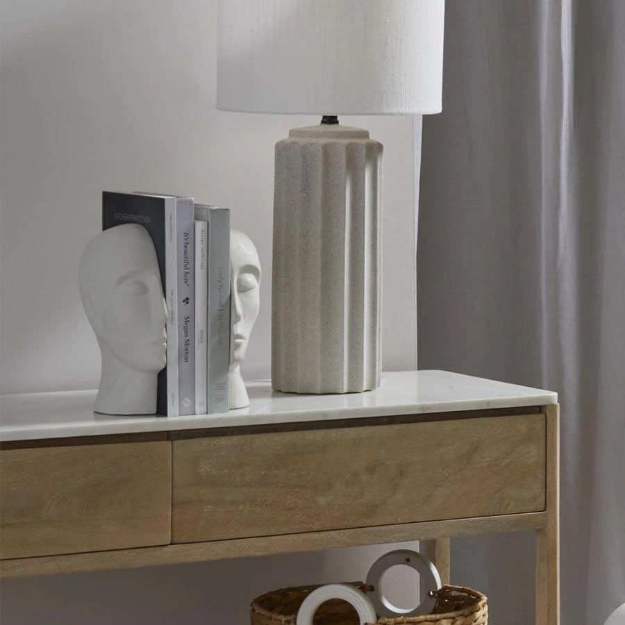 Made from terracotta, each piece features half a face in a white wash colour palette.