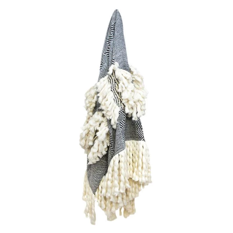 Featuring a beautiful black woven design and thick cream tufts, this is a modern mix of tribal inspired & boho style.