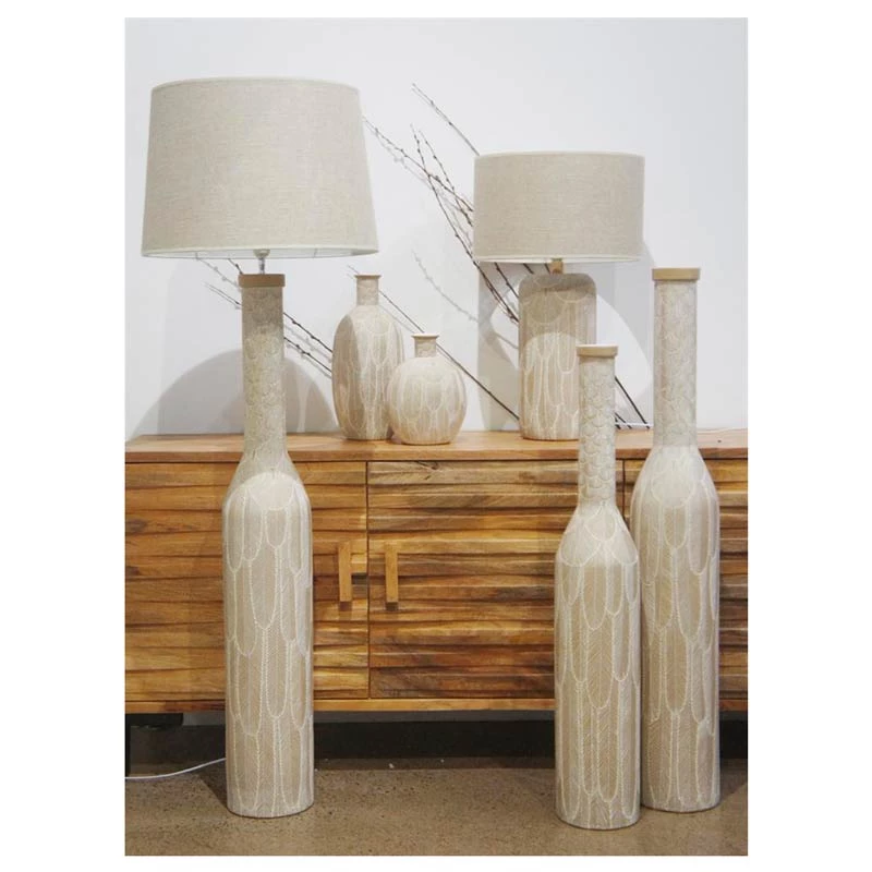 This spectacular and unique lamp features an engraved feather design and is complimented by an oversized linen style shade.