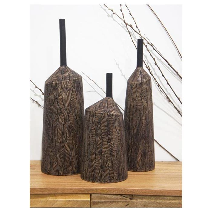 This large vase features a hand carved leaf design and is finished with a distressed chocolate brown colour.