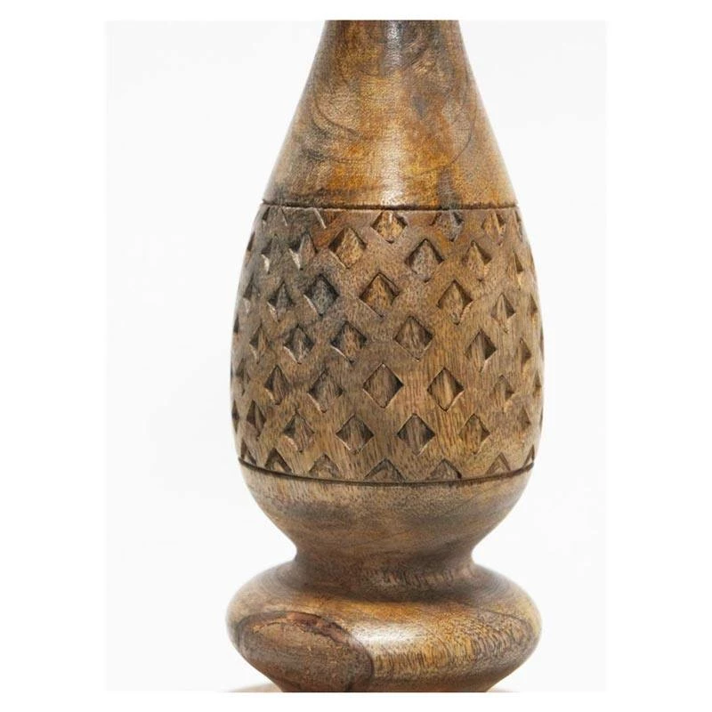 This unique wood carved candle holder features an intricate design and a large base making it the perfect centerpiece paired with a pillar candle. Use as a single accent piece or in multiples.