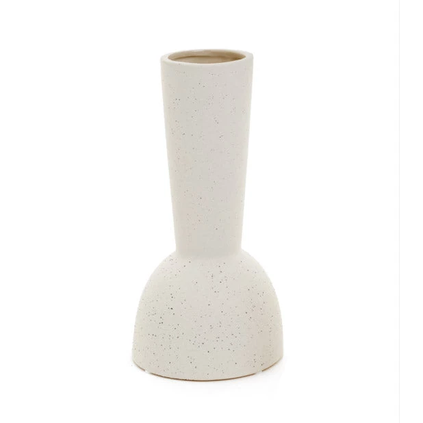 This modern vase will complement any style of decor. The off-white speckled finish and unique shape will look positively wonderful with or without flowers.
