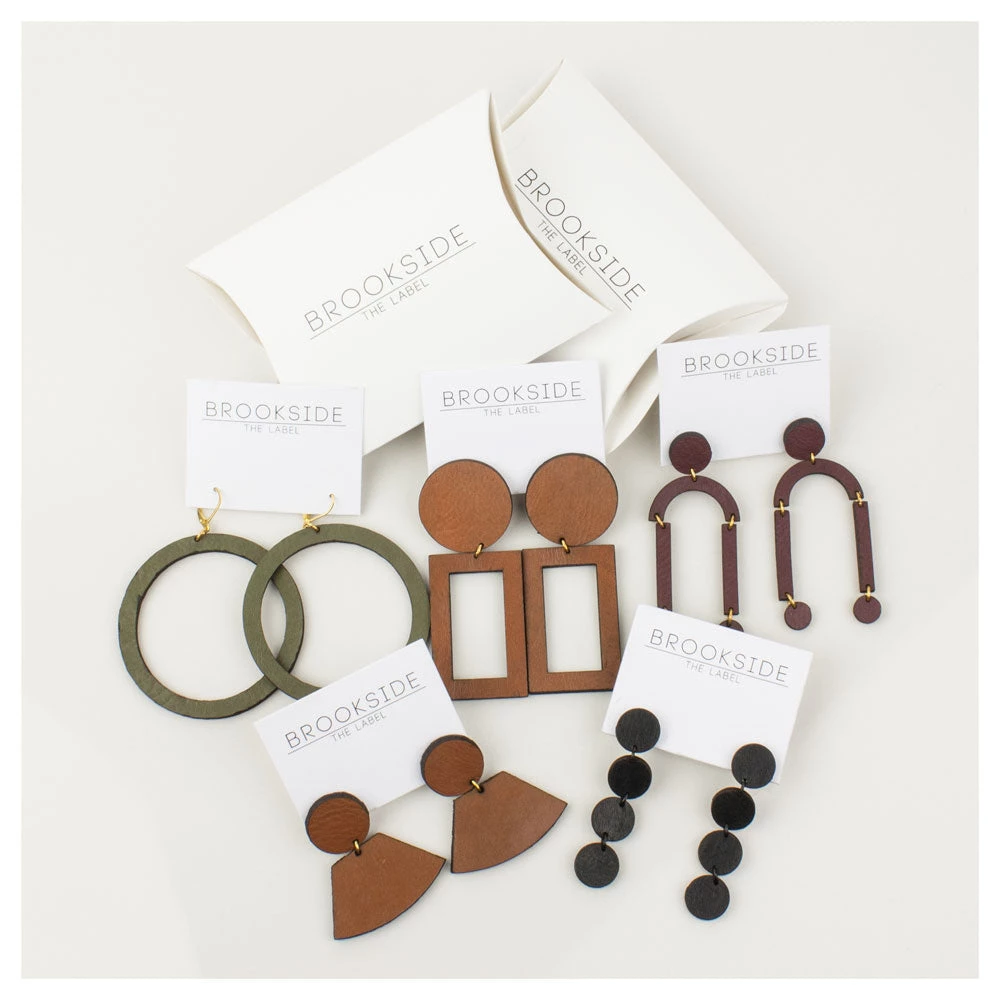 Brookside earrings are made using a durable cowhide and have a two-sided leather finish.