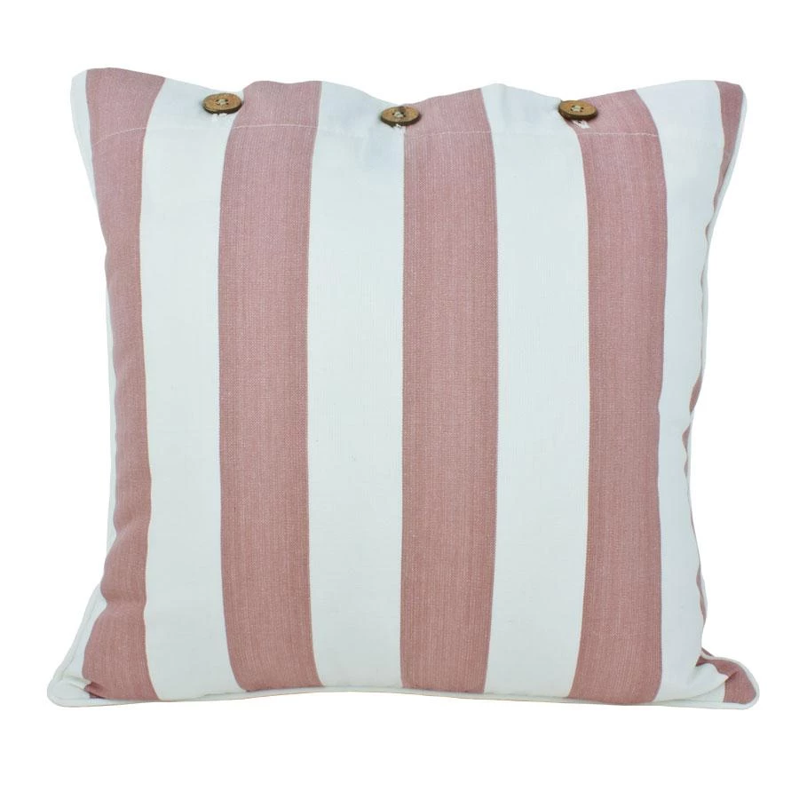 Featuring a soft pink stripe, white piped edge and wooden buttons, this cushion will look fabulous wherever you decide to place it.