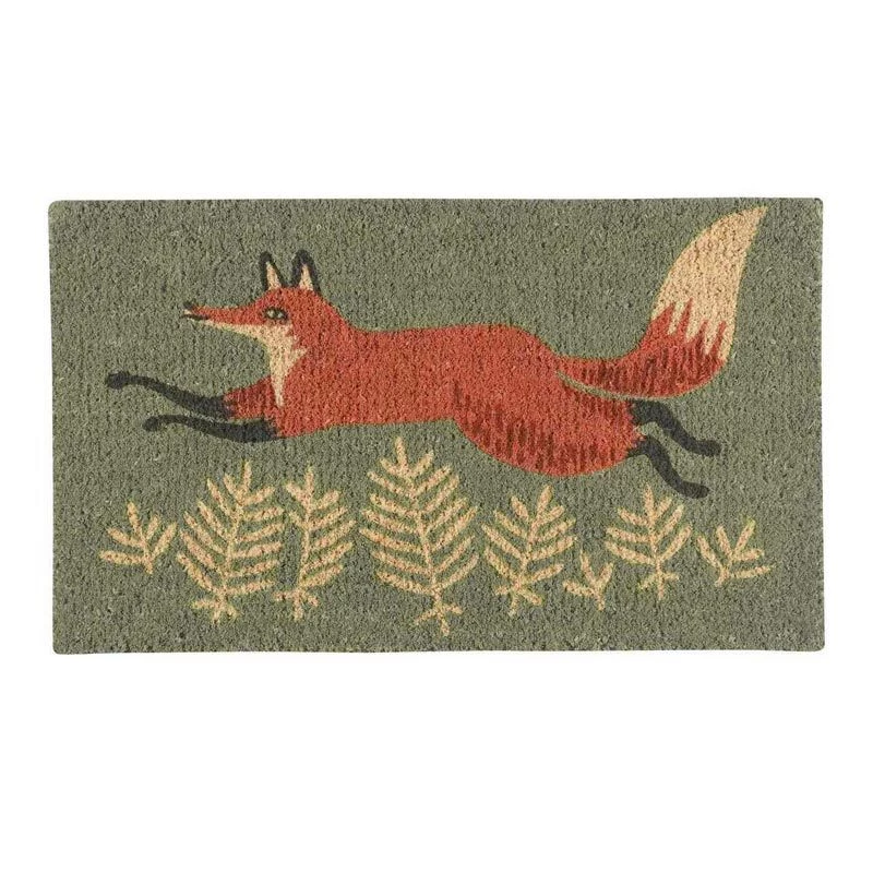 A bounding fox leaps through lush foliage against a green background. This coconut fibre doormat will make visitors feel welcome.