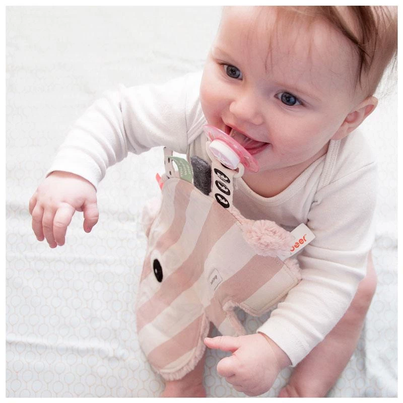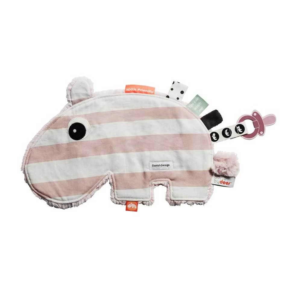 Baby’s best friend! The cheerful hippo Ozzo is a cozy security blanket with different textures, a pacifier clip and tags for little fingers to explore.