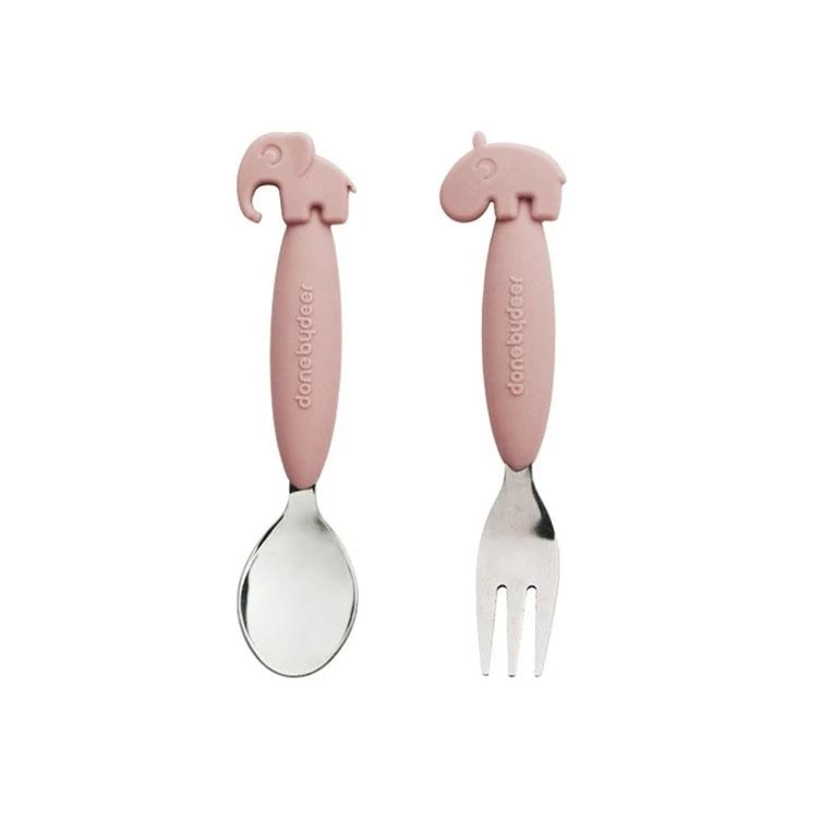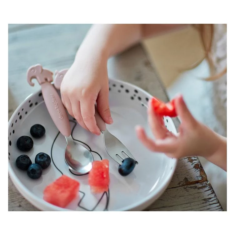 Cute and practical kids spoon and fork set with easy grip silicone for little hands with great ambitions.