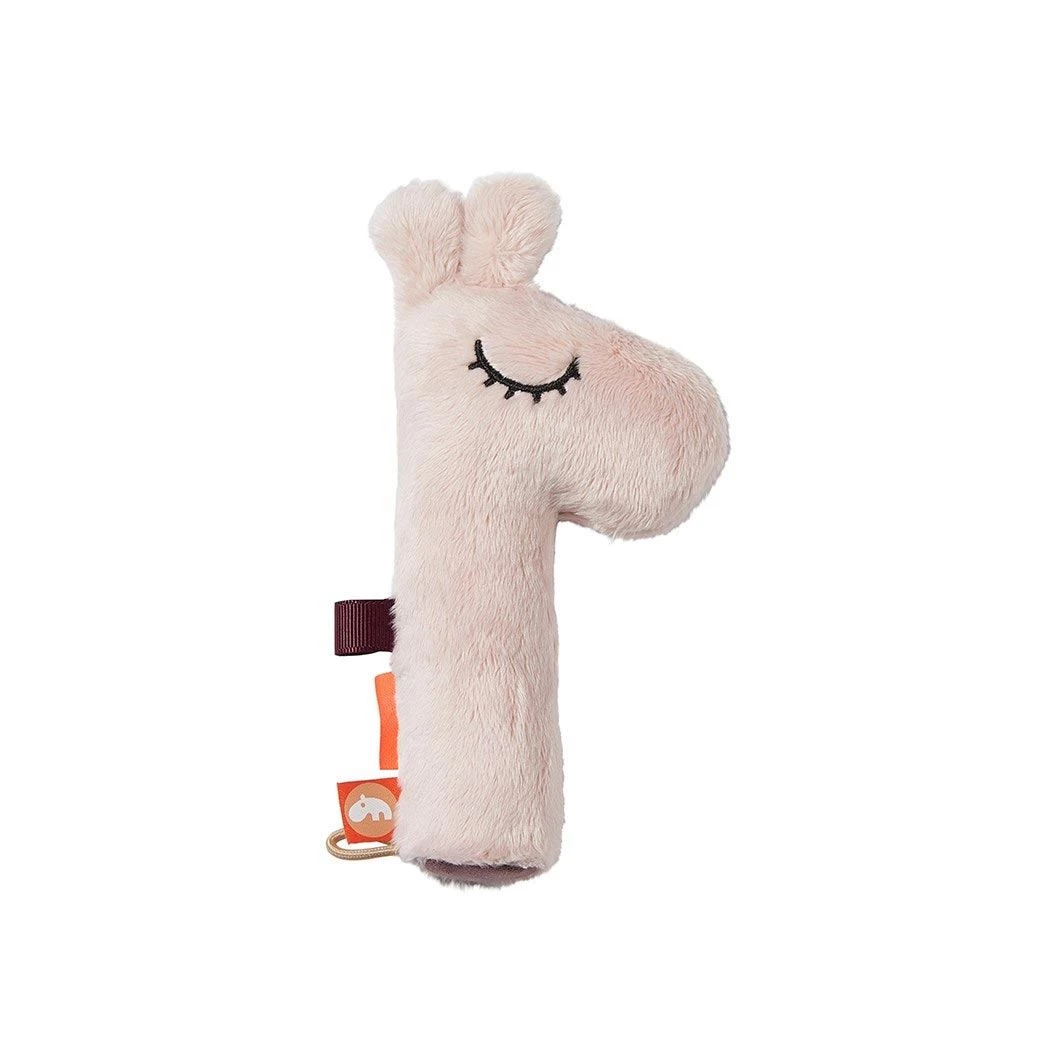 Raffi’s long neck is perfect for little fingers to grasp – ready to explore the sounds of the sweet rattle and exciting squeaker.