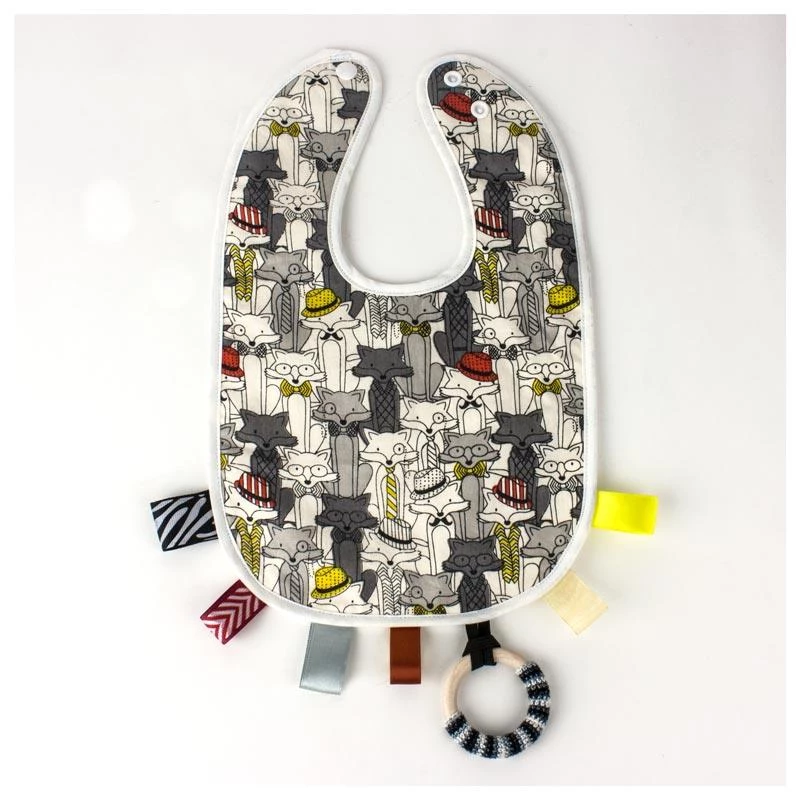 The Teething Bib comes with a natural, untreated wooden teething ring, which can be removed and a favourite toy or dummy hung in its place.