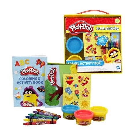 Box includes: 3 x 28g Cans of Play-Doh, 6 x Crayons, Sticker Sheet, Double Sided Activity Mat, Colouring Book.
