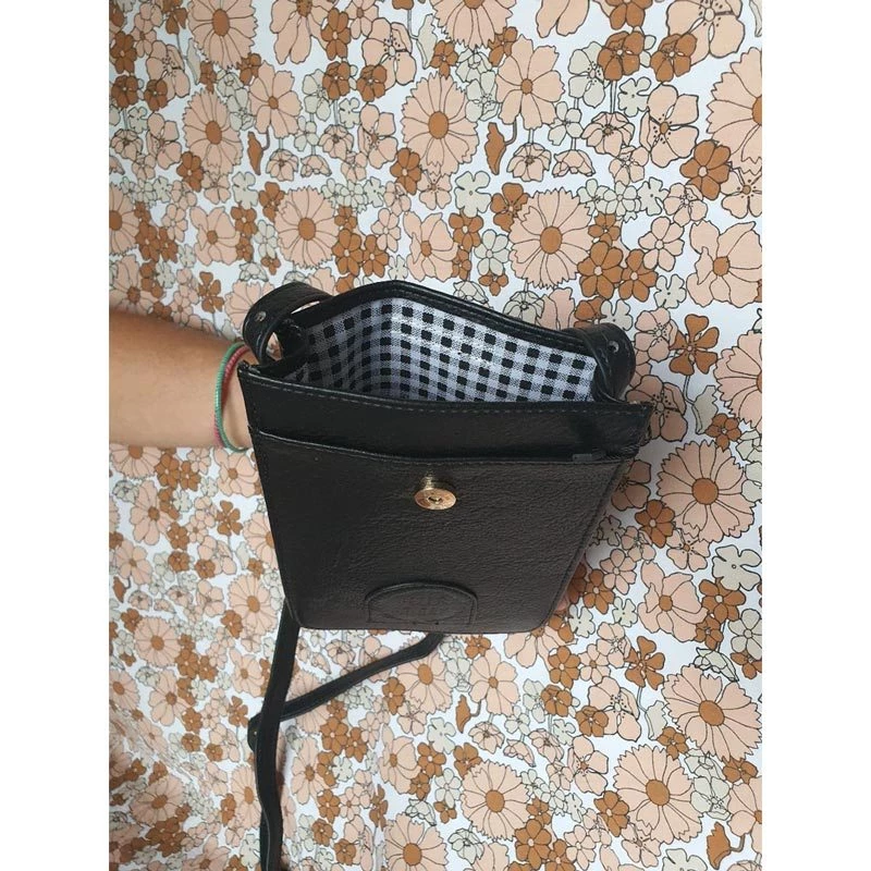 It’s rectangular profile opens with magnetic fastening, three discreet card slots at the back, and a cotton-lined gingham material interior roomy enough for phone and you lip balm.