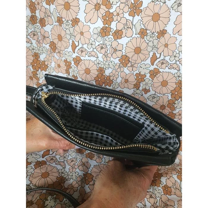 Cotton Gingham Material interior that includes two slots for cards and separate pocket. This wee gem is big enough to hold your phone, glasses & a few small bits and bobs.