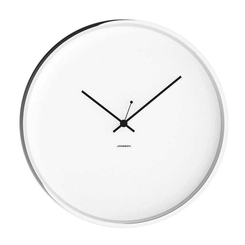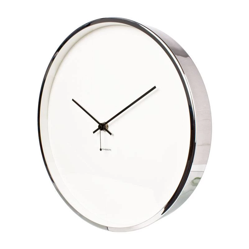The minimal wall clock features a beautiful polished chrome steel case with white face and black metal hands.