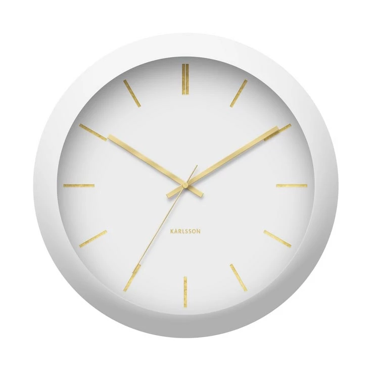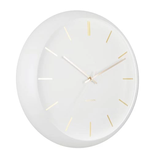 The Globe Wall Clock by Karlsson is an elegant white iron clock with gold accents and a convex domed glass front.
