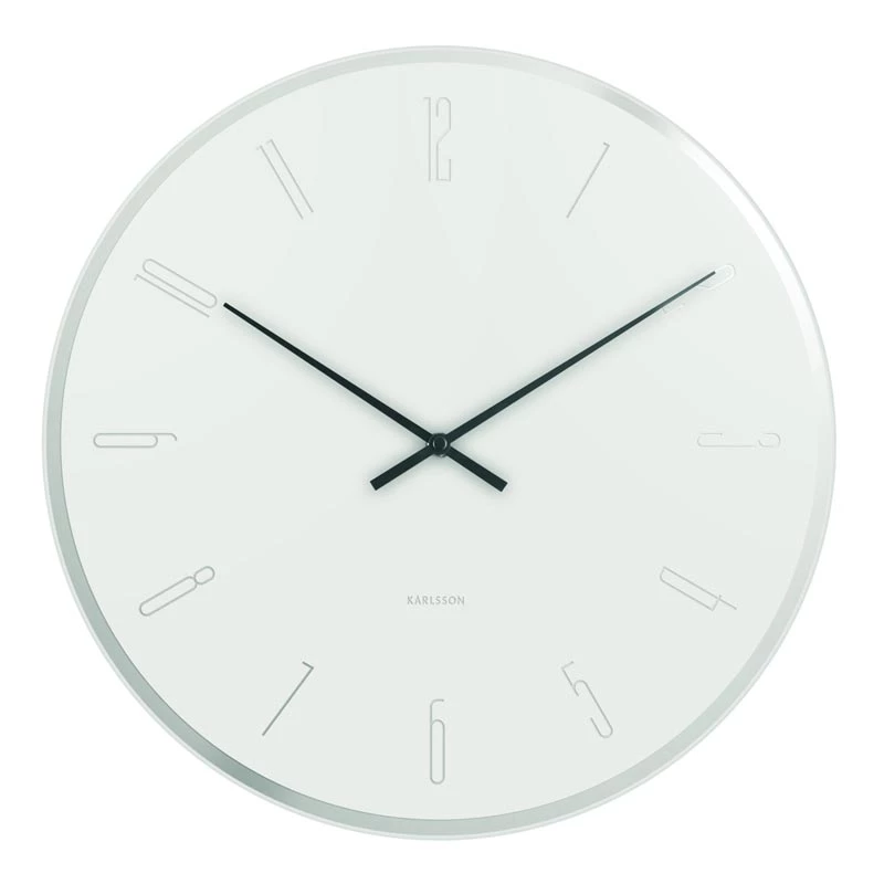 This sophisticated glass clock features a mirror edge, mirror numbers, white dial and black hands.