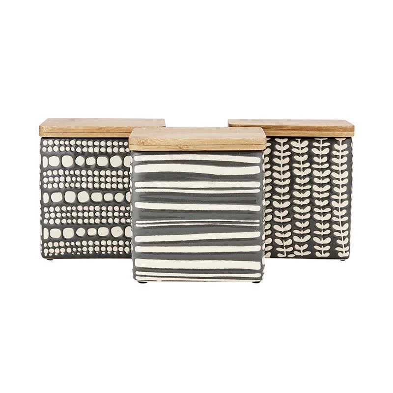 Each beautiful stoneware canister features a different but complementary design for a lovely bench-top look and they have a bamboo lid with silicon seal to help keep contents fresher for longer.