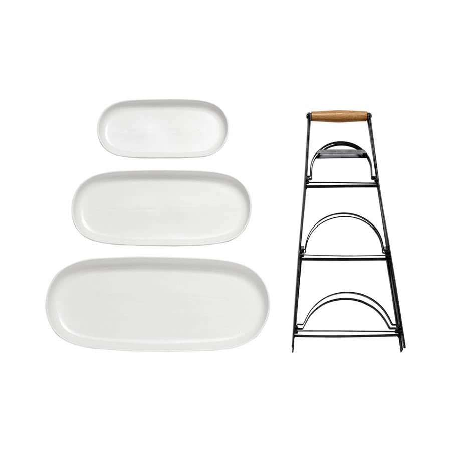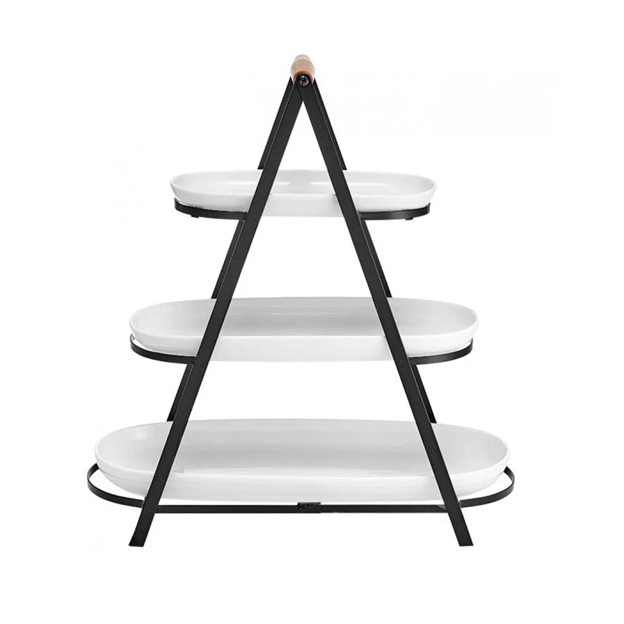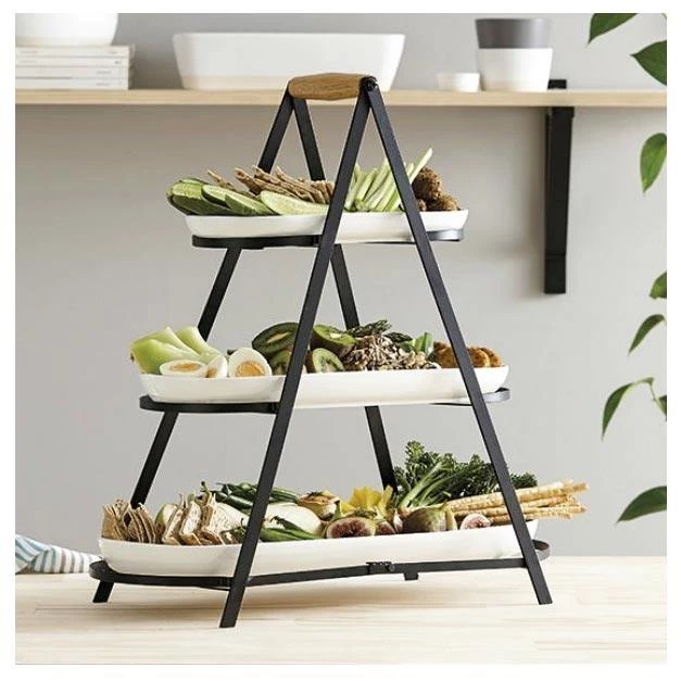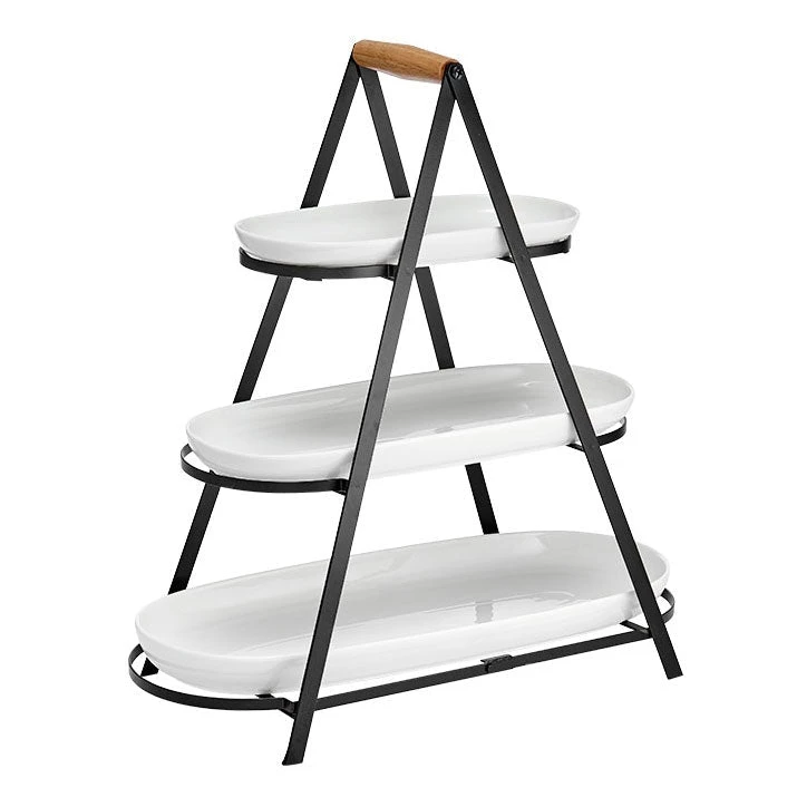 The sturdy frame holds three oval porcelain plates and the handle makes it easy to carry.