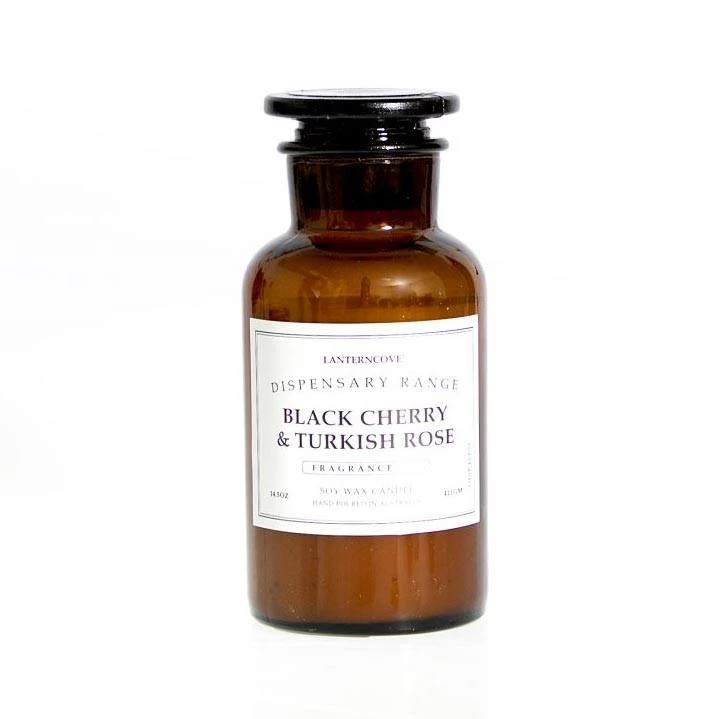 Hand-poured in Australia, these large vintage inspired glass apothecary jars have been filled with a rich, creamy soy wax and combined with the pleasantly delicate fragrance notes of Black Cherry & Turkish Rose.