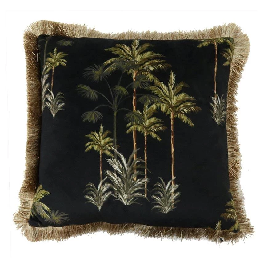 Beautiful velvet palm tree cushion with gold fringe detailing. Will add a luxurious touch to any space.