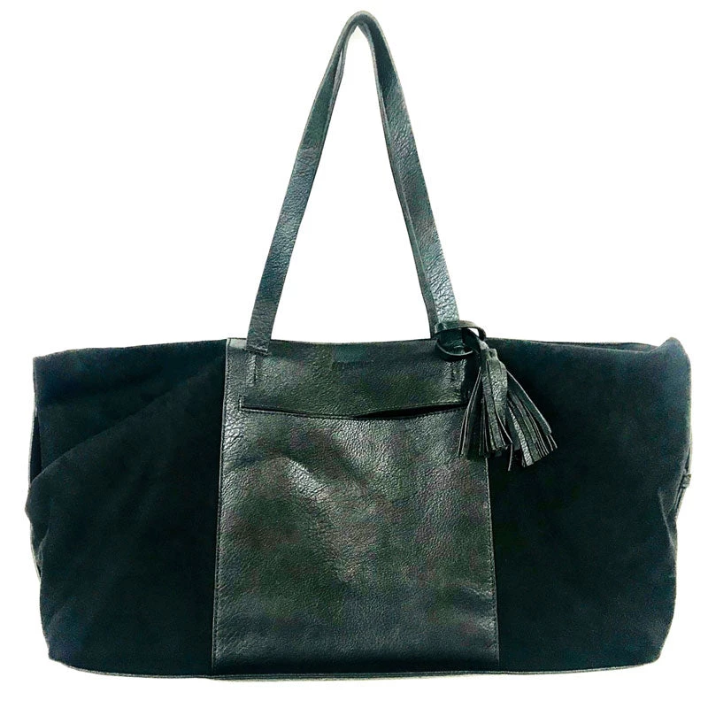 Featuring a lined large internal pocket with smaller zip pocket, phone pocket, external pocket. The exterior features a mix of two fabrics and has carry handles, adjustable side straps and tassels.