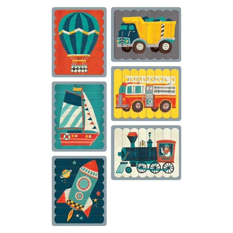 Mudpuppy’s Transportation Puzzle Sticks includes 24 double-sided pieces that create six different eight-piece puzzles!