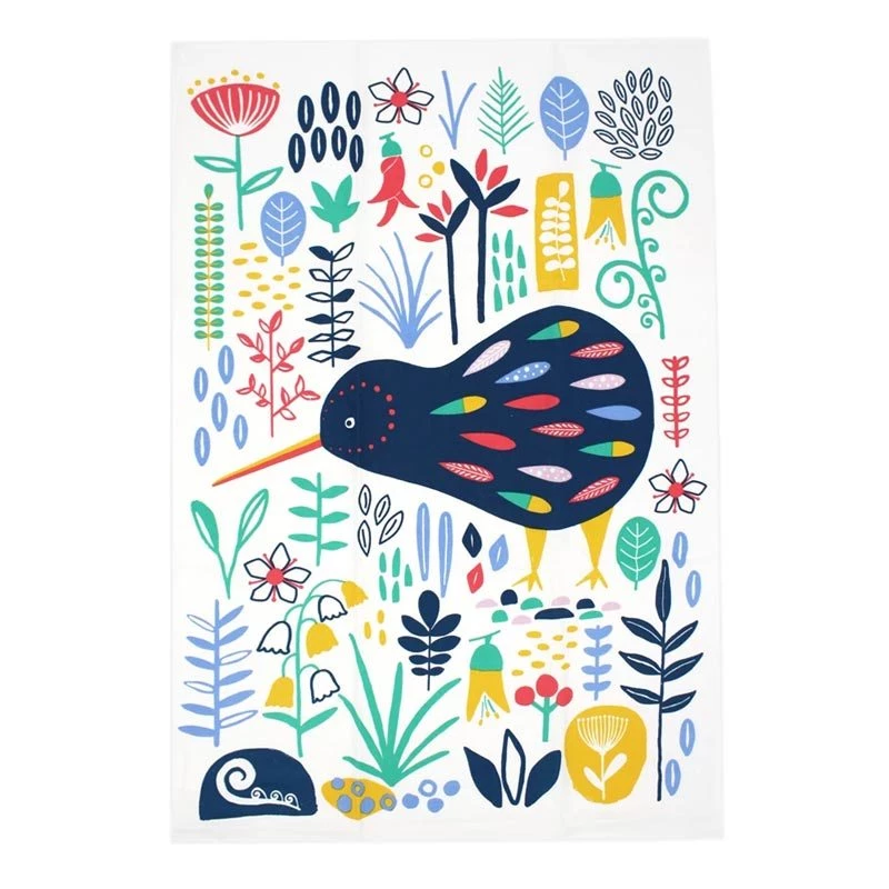 This fun, full colour tea towel features a bold design featuring New Zealands native kiwi bird and some brightly coloured fauna. Its perfectly… well, kiwi!