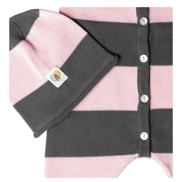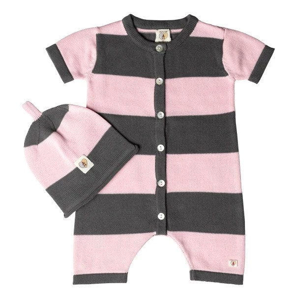 Fun striped all in one snugglesuit. One of our cotton signature pieces complete with a matching pixie hat.