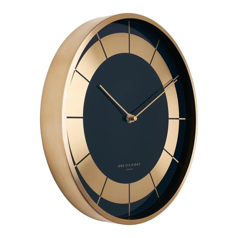 The beautiful navy blue & gold face, together with the luxe champagne-gold brushed metal case & gold accents will bring a decadent look to any interior.