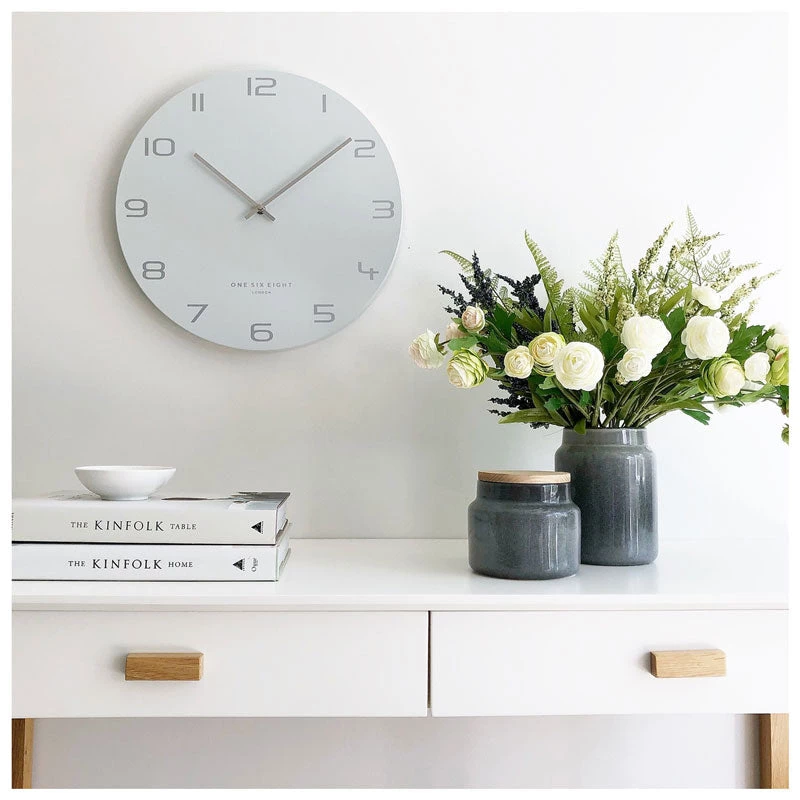 This light white-grey metal clock is adorned with luxe silver numbers and silver hands that add a real richness to the uncluttered dial.