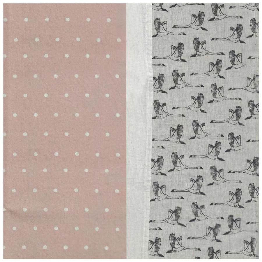 Crafted from 100% cotton, this pack includes two tea towels with hang loops, one with a classic polka dot design and the other with a flying swan print.