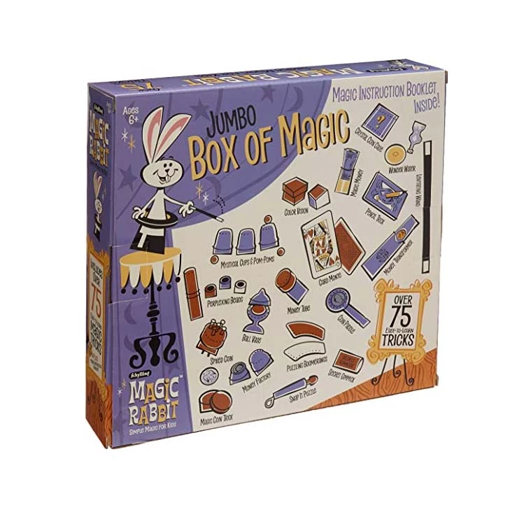 The Magic Rabbit Jumbo Set of 75 amazing magic tricks includes wonderful classic illusions like the Mystical Cups and Pom-poms, the Magic Cup and Ball, Magic Coin Tricks, and many others that you can perform to wow an audience.