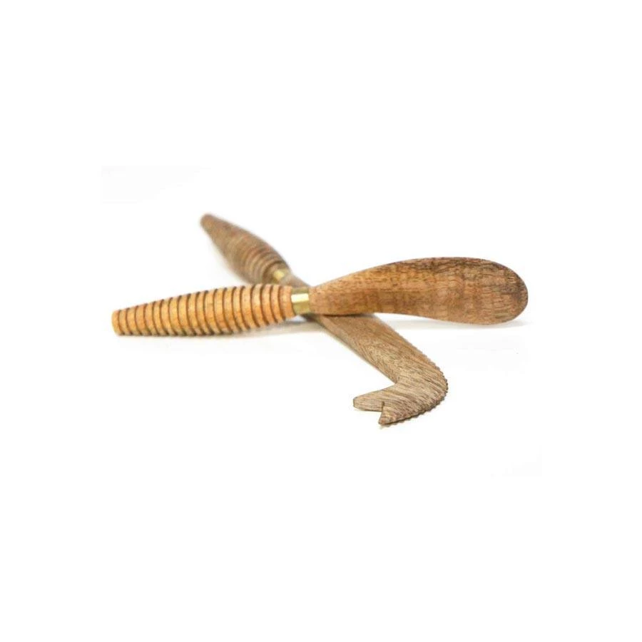 This wooden cheese knife & spreader set features ridged handles and metal accents. Comes nicely presented in a box so makes a great gift.