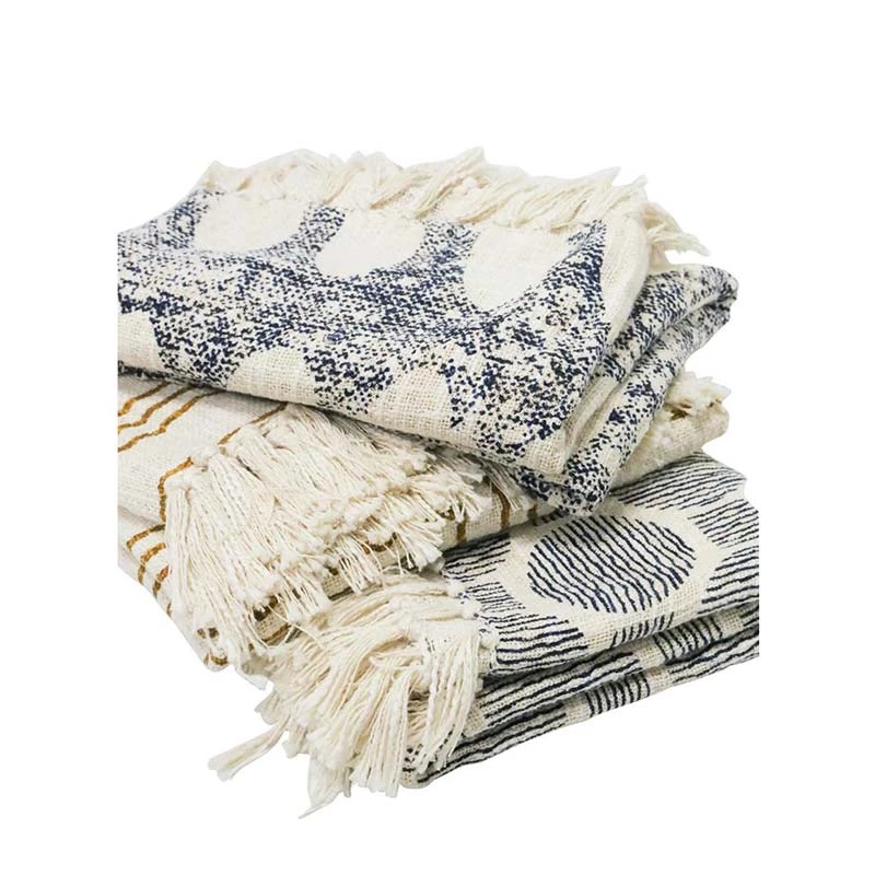 Featuring a unique natural & printed blue design with a knotted tassel fringe, this throw is a fabulous addition to any room.