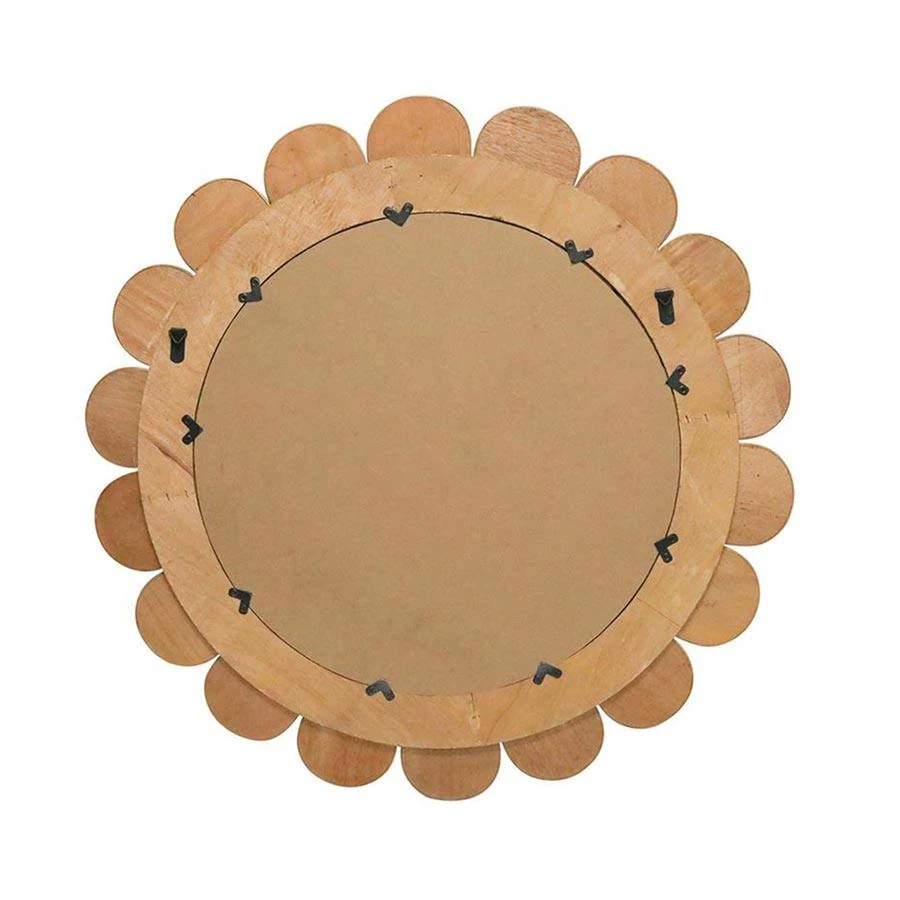 A round mirror surrounded by a woven natural rattan frame. With a bold, petal-like design, this artful piece easily stands on its own and will enliven any wall.