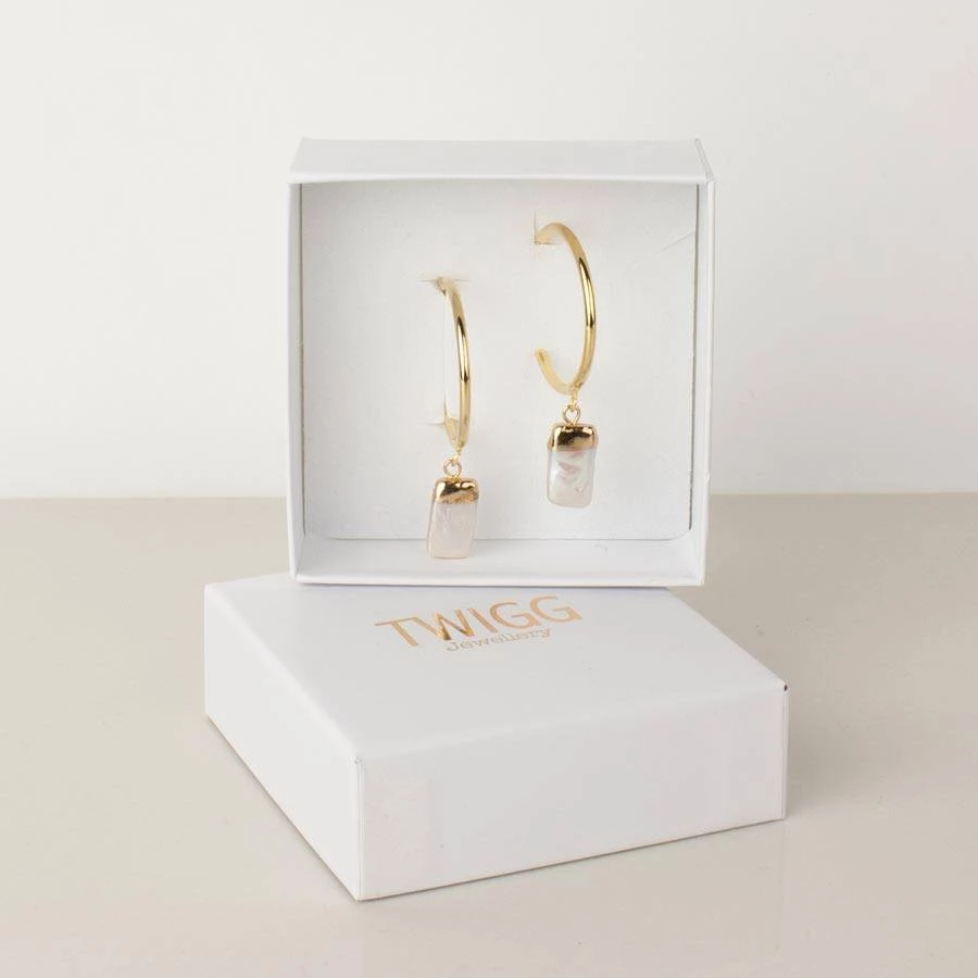 These beautiful deluxe earrings from Twigg feature a 3/4 hoop earring and genuine fresh water pearl.Â