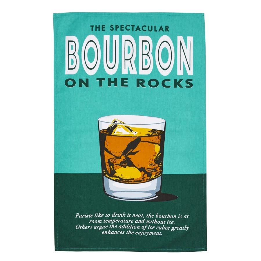 This unique tea towel featuring a classic Bourbon on the rocks & instructions for enjoying the perfect drink.