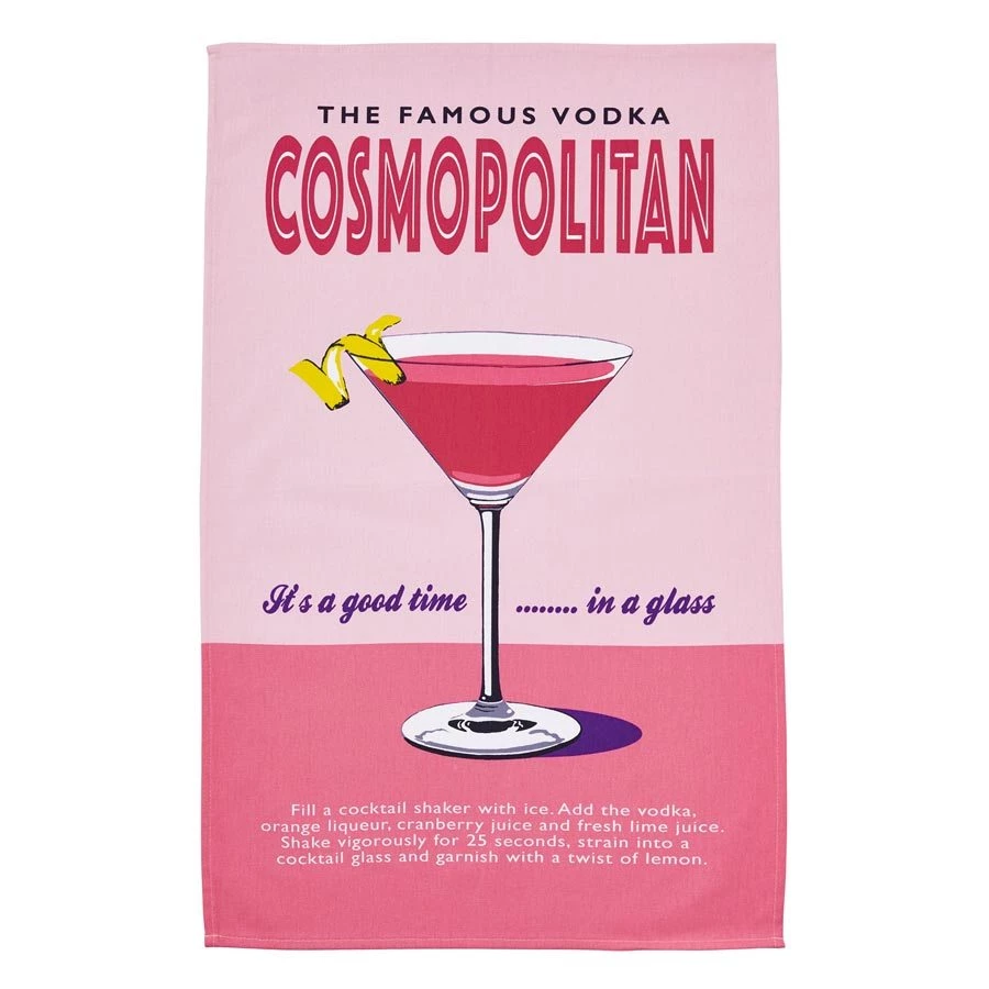 This unique tea towel featuringย a classic cosmopolitan cocktail & instructions for making the perfect drink.