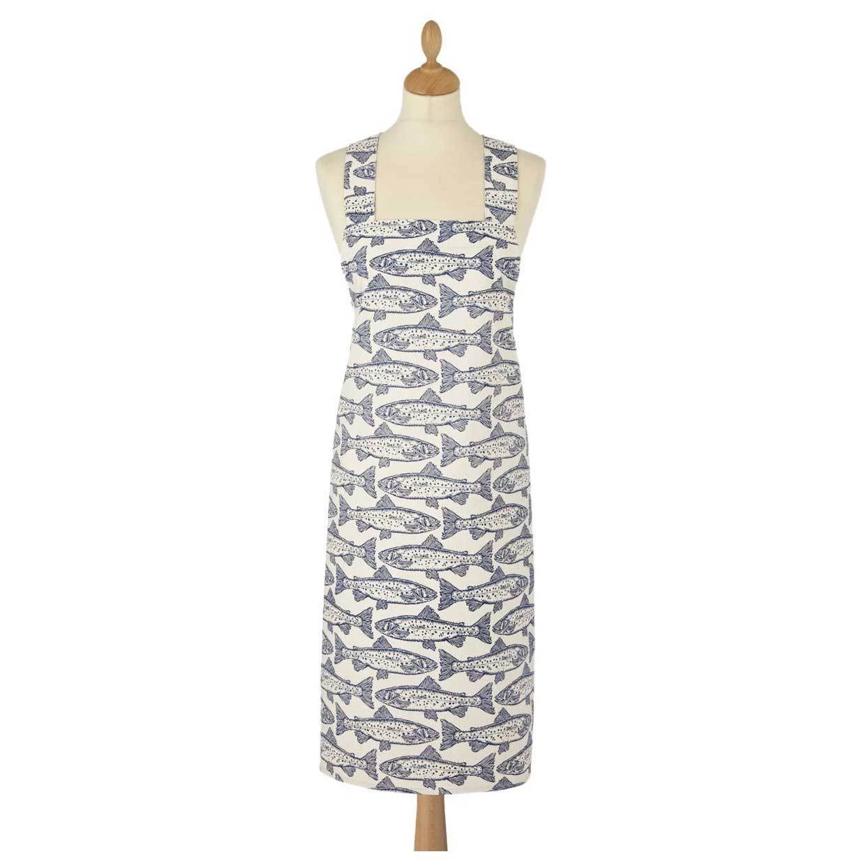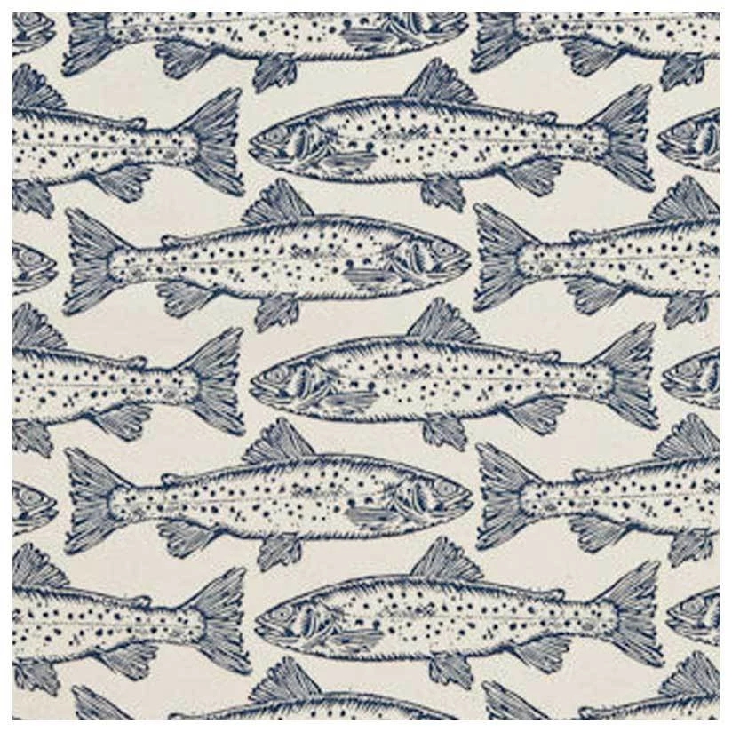 Made from heavy duty 100% cotton, the symmetrical design features a stylised blue swimming salmon.
