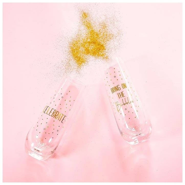 They feature a sleek design and gold lettering. One glass saying ‘ Celebrate’ and the other ‘Bring On The Bubbles’.