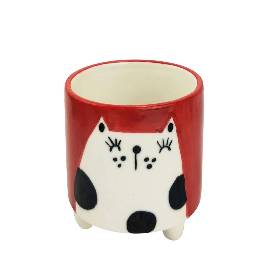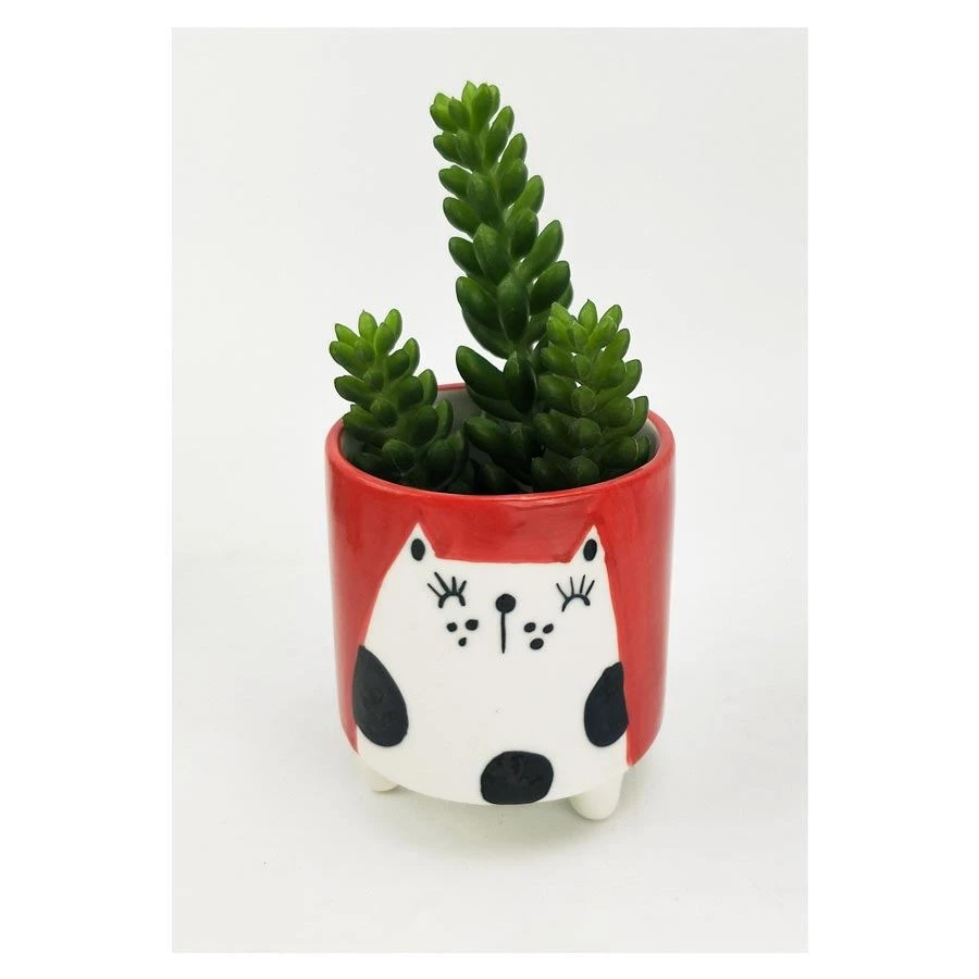 Adorable mini planter with a quirky hand painted cat design on a red background.